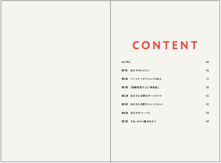 一般的なカルチャーブックと異なり、企業カルチャーの共有にとどまらずに、具体的な事業戦略までを一貫してまとめることで、社員一人ひとりが会社の方針を理解し、自らの役割を再認識し “自分ごと化”できることを意図して構成されています。