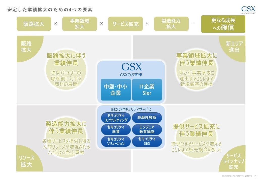 GSXは、2026年3月期までの中期経営計画として、既存事業で年率25%の売上成長を掲げておりますが、今後、さらなる成長をより確かなものにすべく「成長のための4つの要素」を設定し、それぞれの目的に対し共に強力に事業を推進できる戦略的パートナー企業と資本業務提携も含めた提携関係を構築し、事業拡大と企業価値向上を目指して参ります。
