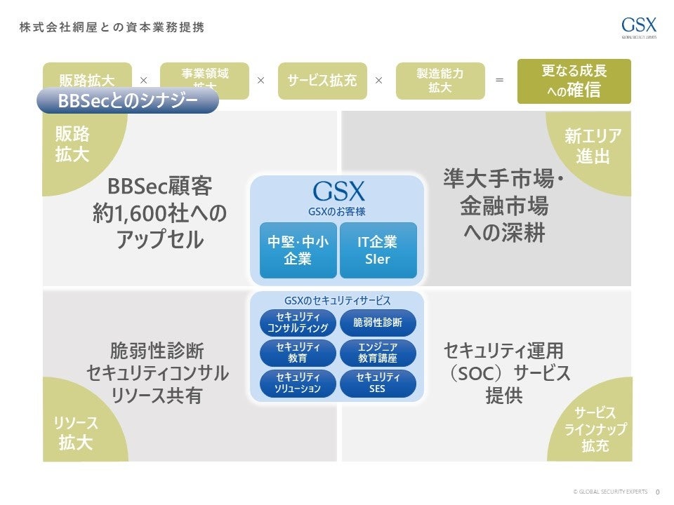 また、このたびの株式取得に伴い、BBSecはGSXの持分法適用会社となることで連携が強化され、双方の企業価値向上に伴う事業成長が実現されます。