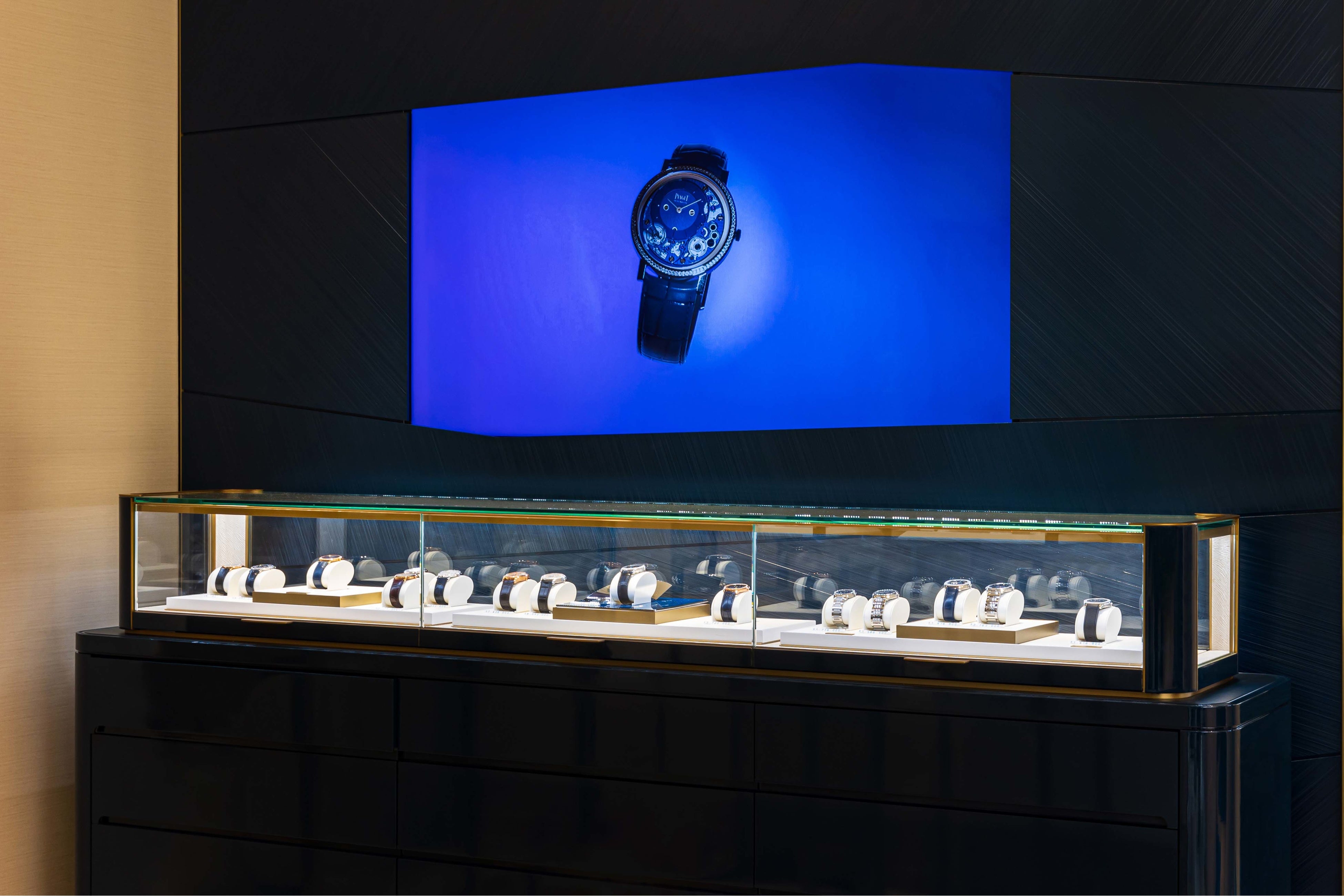 ホワイト、ゴールド、ブルーの3色を基調にした店内には、日本国内初となる新コンセプトが採用されています。ウォッチメイキングのクラフツマンシップが感じられるプレゼンテーションコーナー「Elegance of Watchmaking」や、ピアジェのシグネチャーであるゴールドの色彩やパレス装飾をイメージしたアートウォールが、メゾンの世界観を演出します。