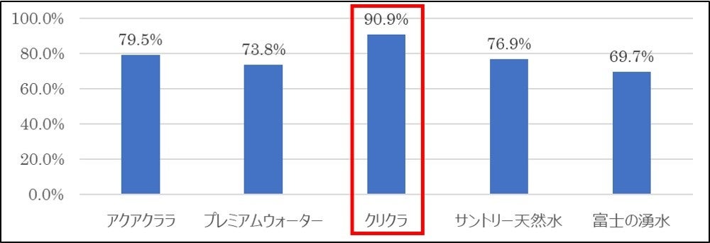▲「味・おいしさ」において、90.9%で「クリクラ」が1位。2位は79.5%で「アクアクララ」、3位は76.9%で「サントリー天然水」となりました。
