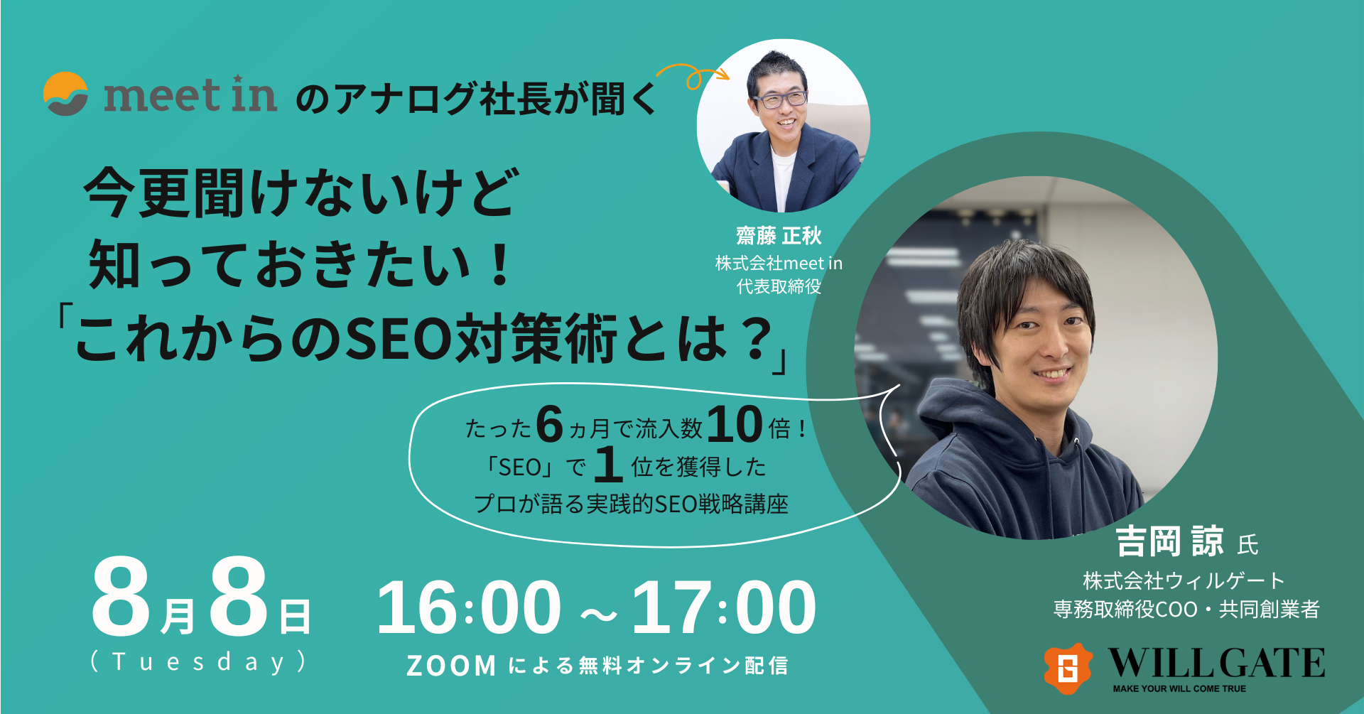 たった6ヵ月で流入数10倍!プロが教える実践的SEO戦略講座【8 月 8 日(火)開催】meet in のアナログ社長が聞く今更聞けないけど知っておきたい!「これからの SEO 対策術とは?」