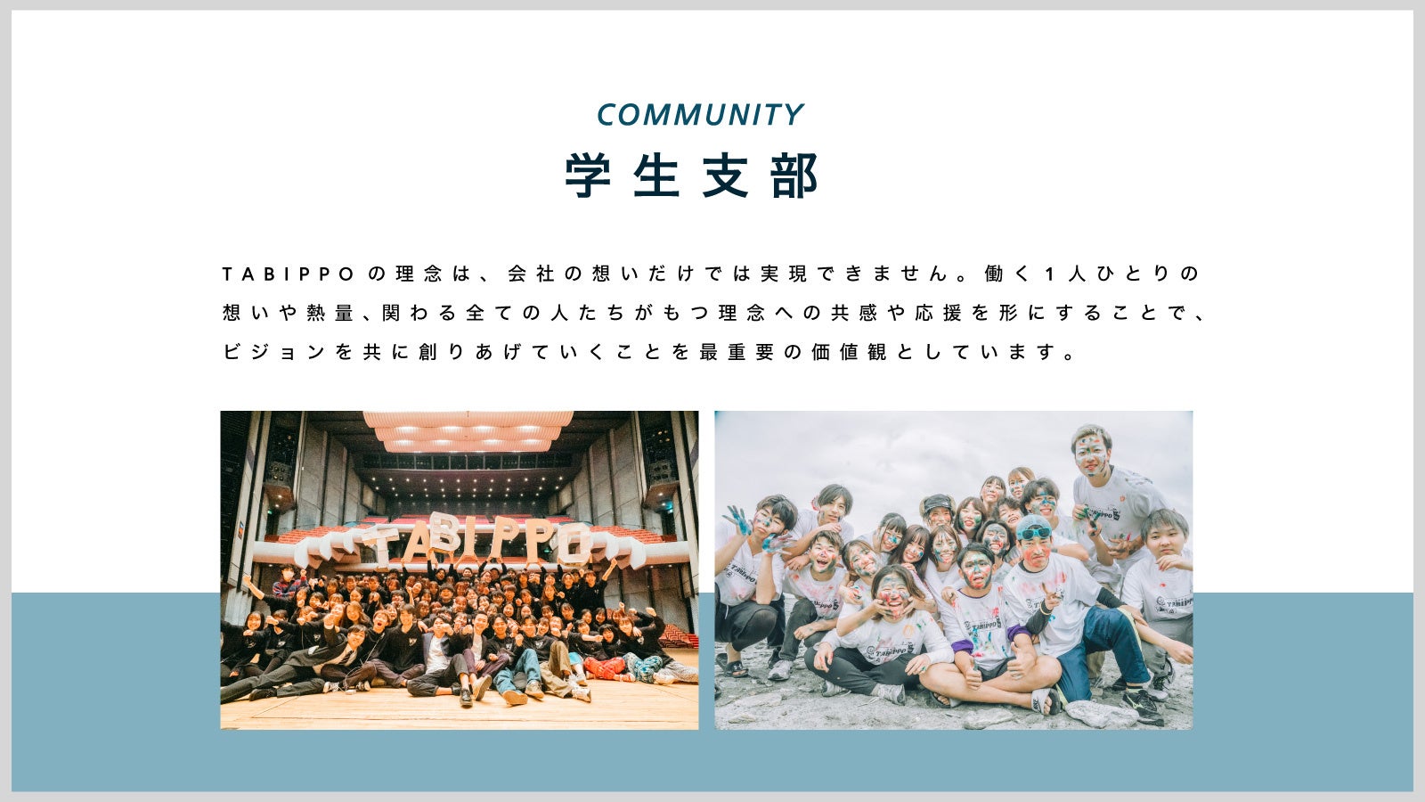 2010年からスタートしたTABIPPO学生支部は、2023年度の活動で14年目を迎えます。全国に毎年300-400人の学生が集まり、イベントやコンテストの企画・制作・運営などの活動を行い、OB・OGコミュニティは5,000名以上と、歴史と文化のある事業です。