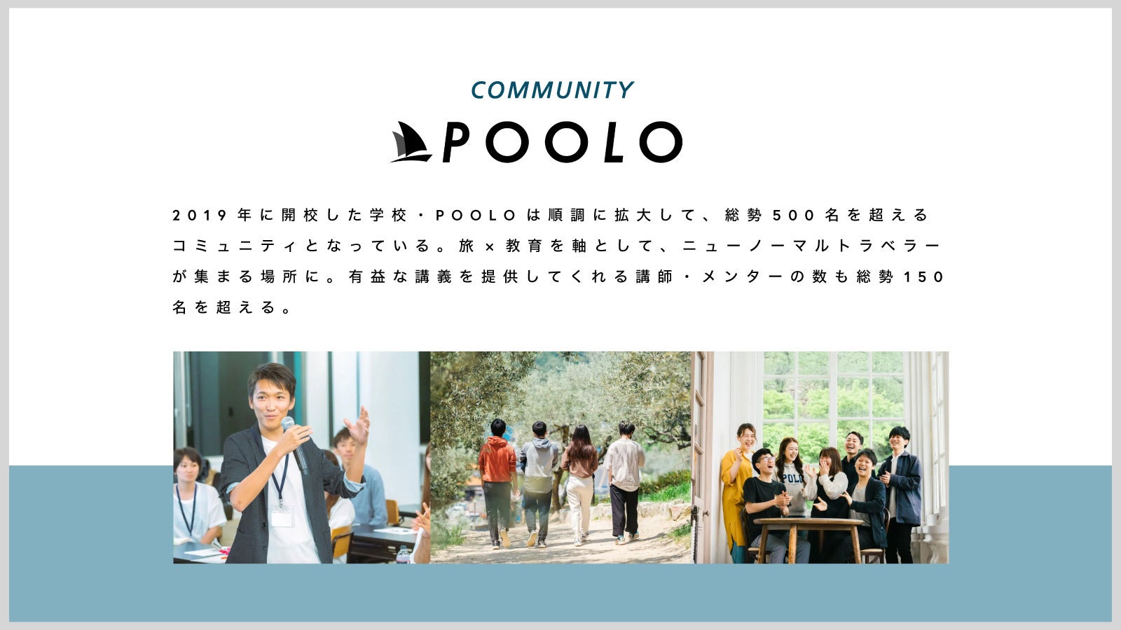 2019年に開校したニューノーマルトラベラーの学校・POOLOは順調に拡大して、総勢500名を超えるコミュニティとなっています。旅×教育を軸として、ニューノーマルトラベラーが集まる場所に。有益な講義を提供してくれる講師・メンターの数も総勢150名を超えました。現在は、キャリアデザインコースである「POOLO」、次世代リーダーコースの「POOLO NEXT」、トラベルクリエイターコースの「POOLO JOB」という3つのコースを選択できるようになりました。