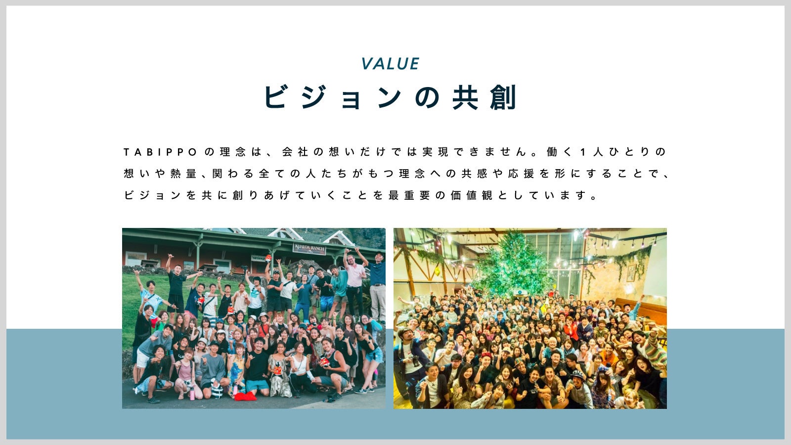 TABIPPOで働く1人ひとりの想いや熱量、関わる全ての人たちがもつ理念への共感や応援を形にすることで、ビジョンを共に創りあげていくことを最重要の価値観としています。