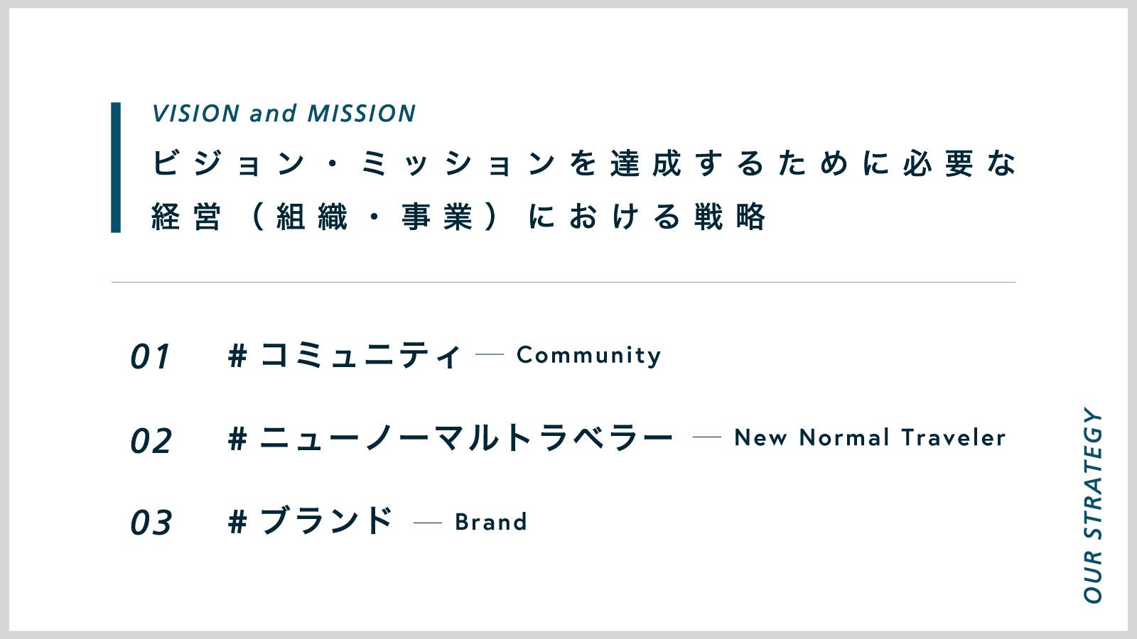 また、ビジョンとミッションを実現するためのあたらしい経営戦略として「コミュニティ」「ニューノーマルトラベラー」「ブランド」という3つのキーワードを定めました。