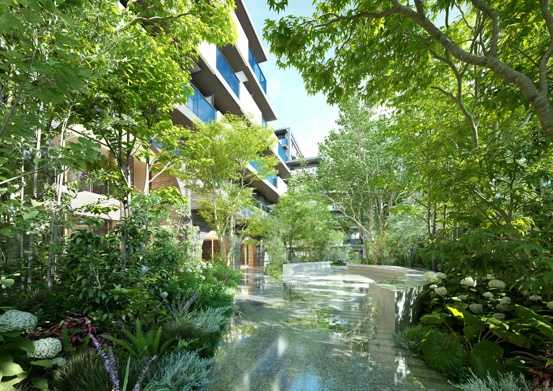 Ⅰ・Ⅱ・Ⅲ合わせて約130m以上続くプロムナードでは、雑木林を思わせる豊富な緑でアーチを連続させることにより3物件の一体感を演出しました。人の通り道としての役割を果たすと同時に、敷地の一角にキッチンカーが来訪した際には、プロムナード内に配置されたベンチを活用して、お住まいの方々との交流の場としての役割も担います。