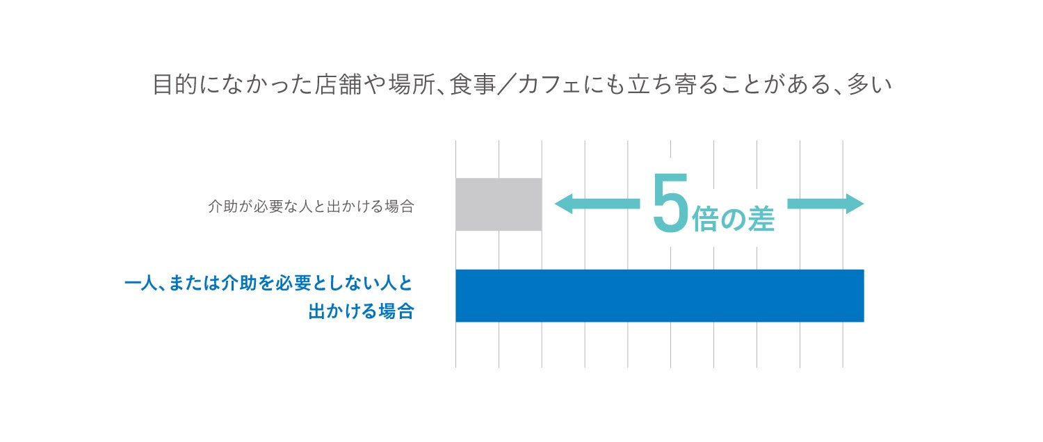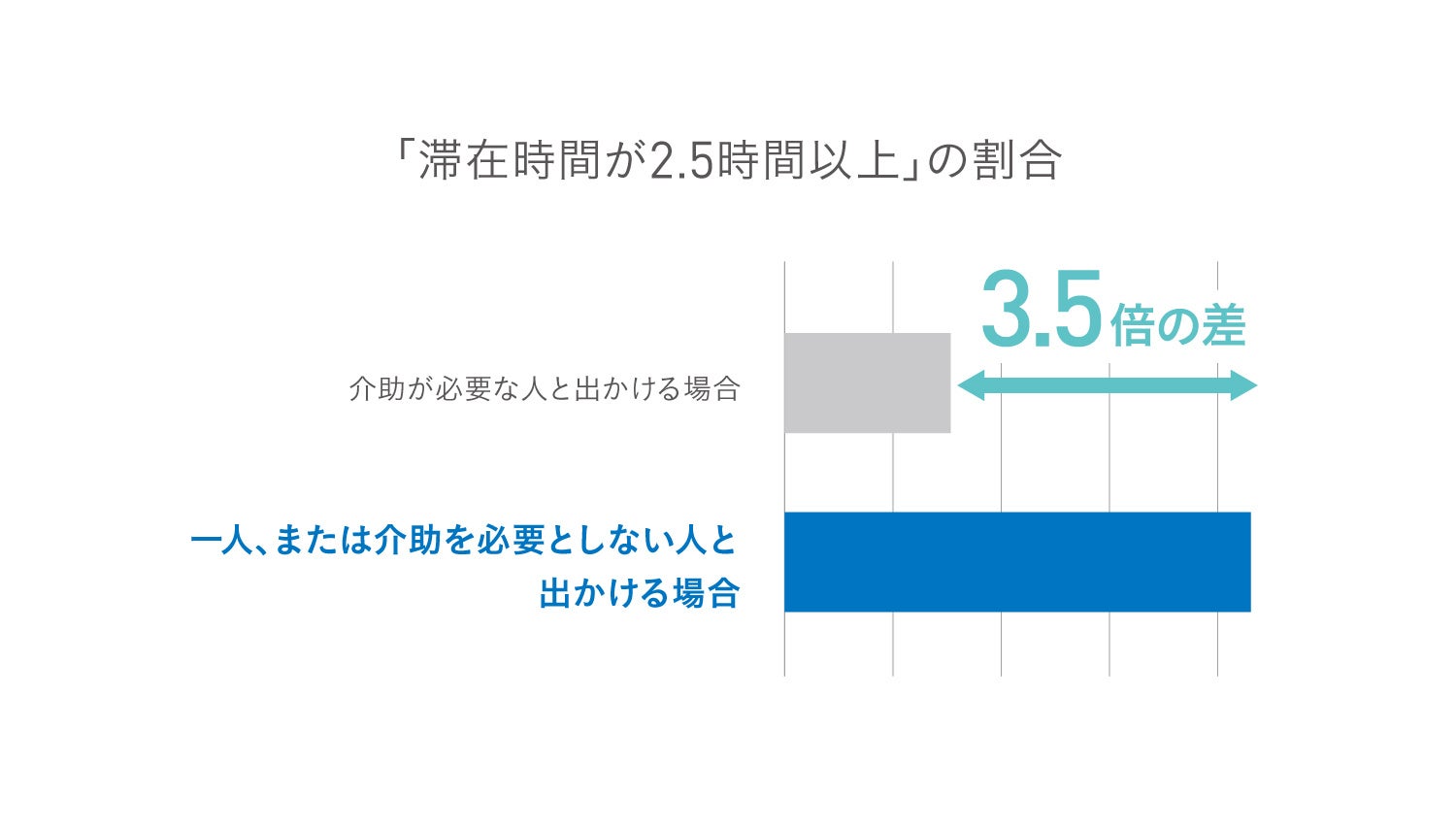 ・介助やサポートが必要な人と出かける場合、本人も同行者も出先での滞在を最低限に抑えてすぐ帰る傾向に。そうでない場合は、長時間の滞在や、目的以外のお店や飲食店への立ち寄りが増える。あらゆる人が快適に過ごせる施設環境が整えば、滞在時間の延伸や多世代の来場につながることが期待できる。