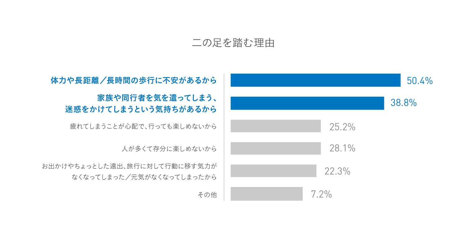 二の足を踏む理由として「体力や長距離/長時間の歩行に不安があるから」が最多(50.4%)で、次に「家族に気を遣ってしまうから」(38.8%)が続きました。とはいえ、施設に設置されていることもある介助式車椅子を使わないシニア世代は97.3%に上り、自由に動けない不便さや、乗りたいと思えるものではないという心理性、同行者への申し訳なさが主な理由です。