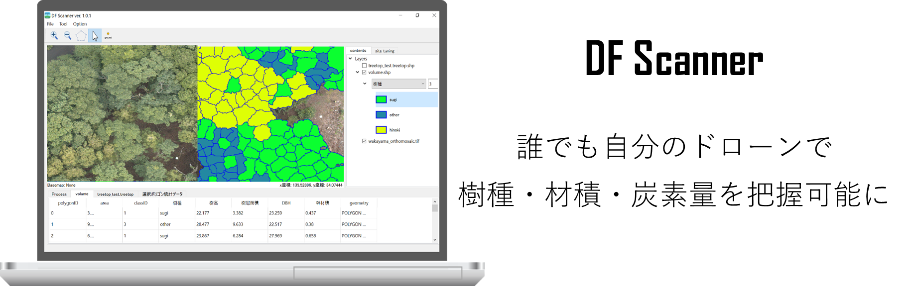 京都大学で開発してきたドローン画像からの森林解析技術を社会で応用するために立ち上がった京都大学発スタートアップのDeepForest Technologies 株式会社。同社は森林科学の知識とAI技術をもとに、森林管理や森林保全に役立つ技術開発を行っています。開発してきた『DF Scanner』は森林管理に関わる誰もがドローンから森林の状況を把握できることを目標に、市販されている安価なドローンから森林の各樹木の樹種やサイズ、材積量や炭素蓄積量の推定が可能なシステムになっています。