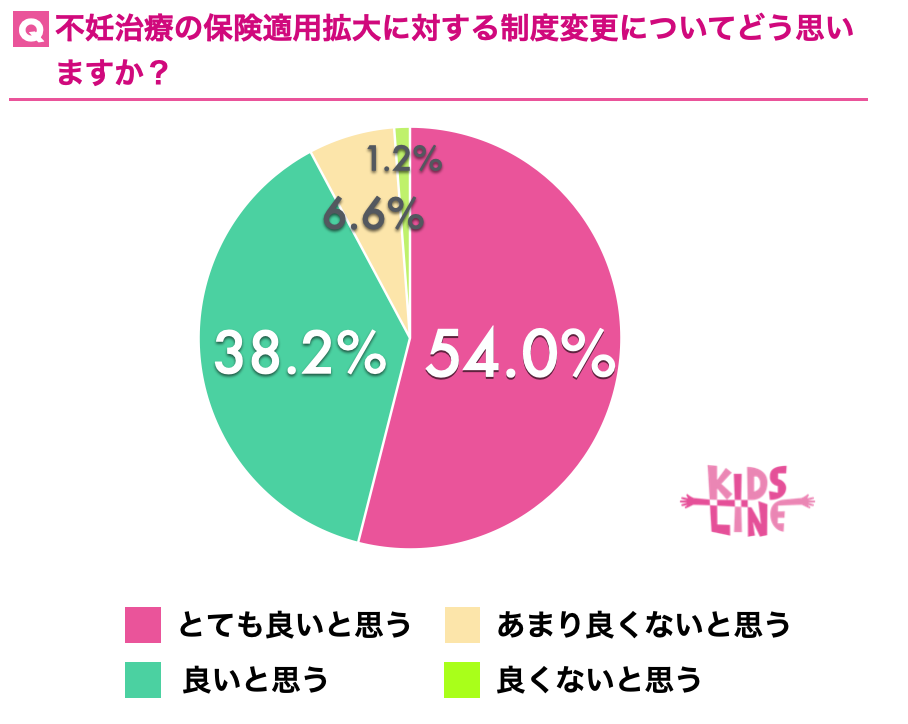 また「不妊治療の保険適用拡大に対する制度変更をどう思いますか?」と質問したところ、「とても良い」が54.0%、「良い」と回答した人が38.2%でした。そこで「とても良い」「良い」と回答した人に理由を聞いてみると「治療を受ける人の金銭的な負担軽減」が93.4%、「社会的に不妊治療の理解が高まる」が57.9%、「治療に前向きな気持ちで取り組める」と回答した人が51.7%でした。他にも「治療を受ける人の母数が増える」「治療をわがままや贅沢と思われなくなる」といった意見も上がりました。