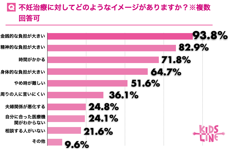キッズライン会員でお子様がいらっしゃるご家庭に「不妊治療に対してどのようなイメージがありますか?」と質問したところ、「金銭的な負担が大きい」が93.8%、「精神的な負担が大きい」が82.9%、「時間がかかる」と回答した人が71.8%でした。