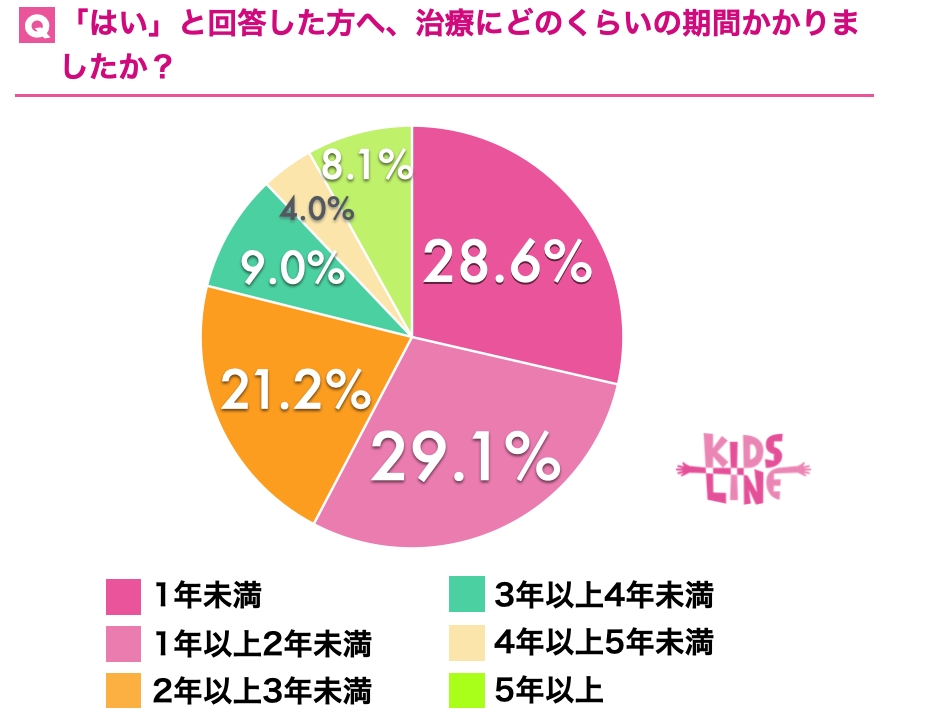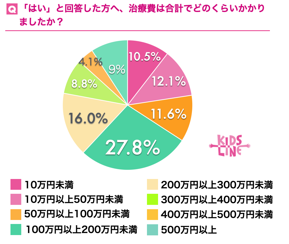 そこで「はい」と回答した人に「治療費は合計どのくらいかかりましたか?」と質問したところ、「100万円以上200万円未満」が27.8%、「200万以上300万未満」と回答した人が16%でした。また、「治療にどのくらいの期間かかりましたか?」と質問したところ、多い順に「1年以上2年未満」が29.1%、「1年未満」が28.6%、「2年以上3年未満」と回答した人が21.2%という結果となりました。