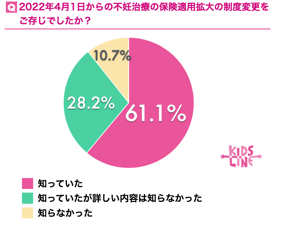 「不妊治療の保険適用拡大に対する制度変更をご存知でしたか?」と質問したところ、「知っていた」が61.1%、「知っていたが詳しい内容は知らなかった」と回答した人が28.2%でした。これらから子育て世代には制度の改正が深く浸透していることがわかりました。