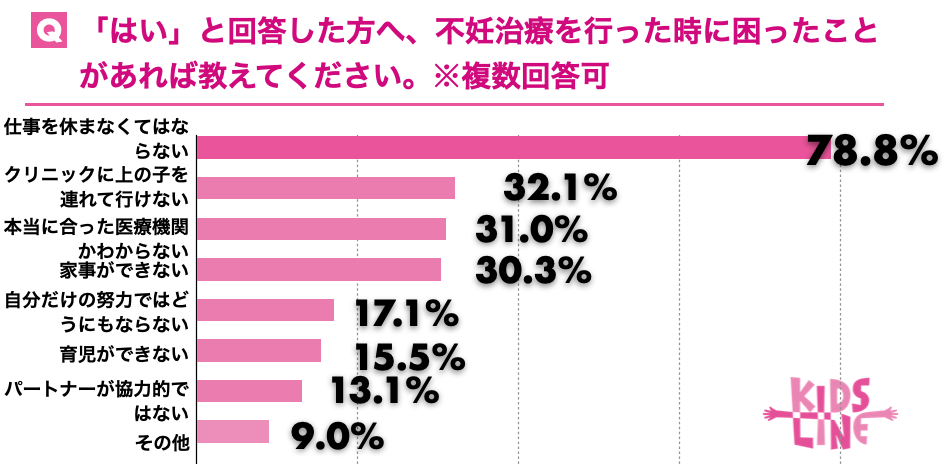 また「不妊治療を行った時に困ったことを教えてください」と質問したところ「仕事を休まなくてはならない」が78.8%、「上の子どもをクリニックに連れて行けない」と回答した人が32.1%でした。これらから精神的、金銭的な負担だけでなく、働きながら治療することへの不安を抱える人もいることがわかりました。