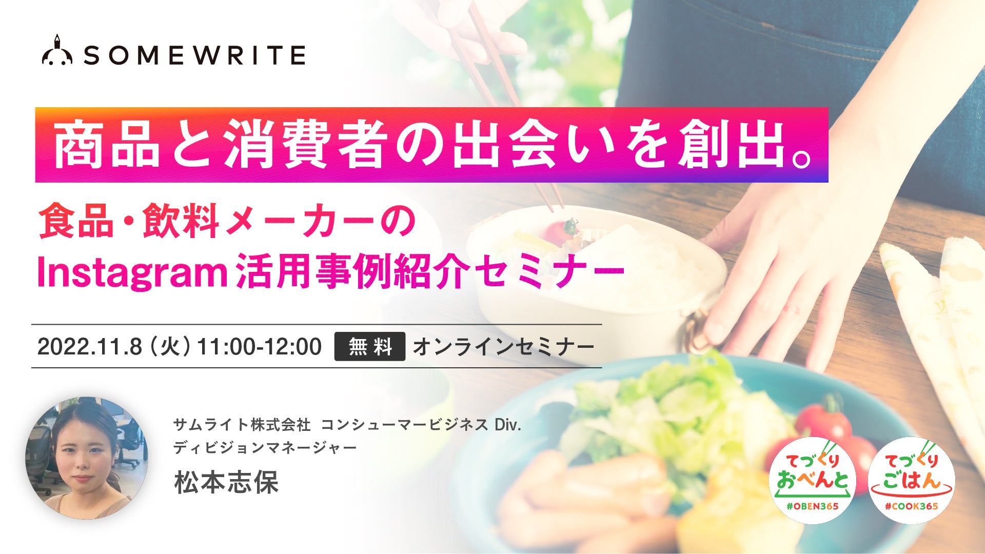 企業のコンテンツマーケティングやメディアビジネス等を支援するサムライト株式会社(本社:東京都渋谷区、代表取締役CEO:池戸 聡、以下「サムライト」)は、自社アカウント運用の経験から得た知見を生かし、食品・飲料メーカーの担当者向けに、Instagramメディア「てづくりごはん365」を活用したタイアップ事例をご紹介するオンラインセミナーを11月8日(火)11:00~開催いたします。