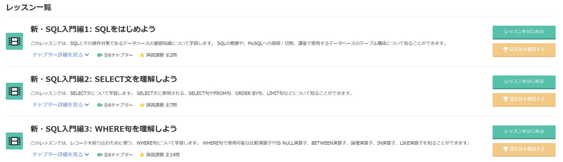 ※利用には会員登録(無料)が必要です。「新・SQL入門編」では一部レッスンを無料公開しています。また、「新・SQL入門編」の開講に伴い、これまで有料だった「DB/SQL入門編」を無料公開しています。