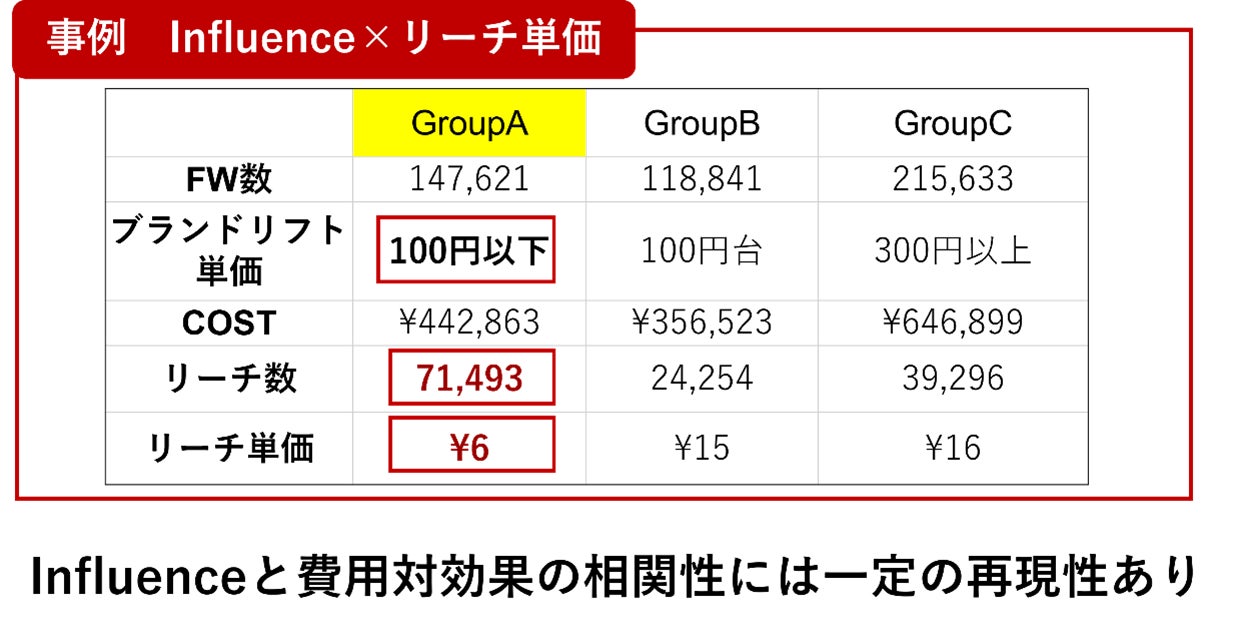 当社の「influence」を利用することで、これまでのプラスアルファとして、各インフルエンサーのターゲット到達率(見込み顧客になり得そうな人々への到達率)とブランドリフト単価を算出し、見込み顧客を最大化するために最適なインフルエンサーを選定することが可能になります。