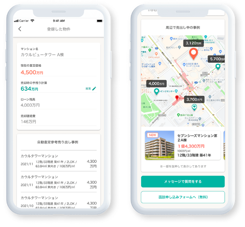 物件探しはもちろん、希望条件の設定や予算組み、個別相談、見学申し込みなどがアプリ内で完結します。収入などの諸条件を入力するだけで、わかりづらいローンシミュレーションや月次払いの費用も簡単に算出します。AIが売買事例や築年数、最寄り駅などのビッグデータからマンションの市場価値を分析し、今まで不透明だった中古マンションの適正価格や35年後までの推定価格を算出するので、一目で中古マンションの資産価値がわかります。