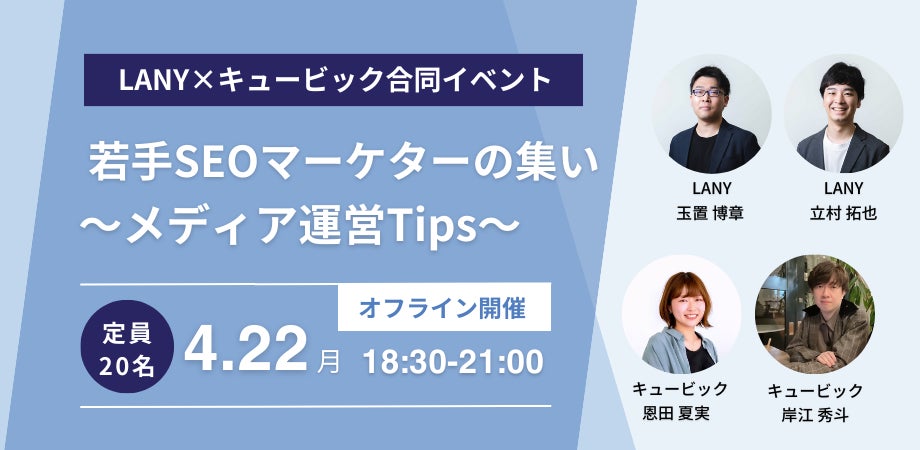 株式会社キュービック(本社:東京都新宿区、代表取締役:世一英仁、以下「キュービック」)は、この度株式会社LANY(以下「LANY」)との共同イベント『若手SEOマーケターの集い〜メディア運営Tips〜』を4月22日(月)18時30分からキュービック イベントスペース「parQ(パーク)」にて開催いたします。