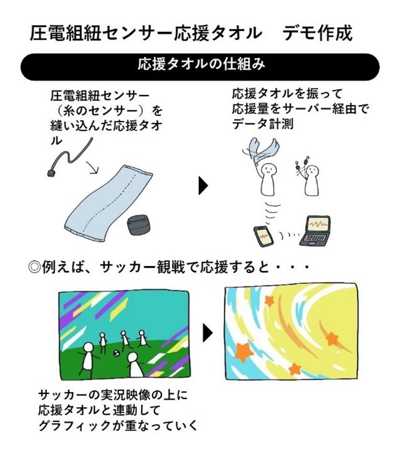 関西大学(本部:大阪府吹田市、学長:高橋 智幸)システム理工学部の田實 佳郎 教授と帝人フロンティア株式会社(本社:大阪市北区、社長:平田 恭成)が共同で開発を進める圧電ウェアルブルセンサー「圧電組紐」(*1)をプロサッカーチームの応援タオルに縫い込み、観戦するファンがそのタオルを振り回す速さや大きさを測定・解析し、動きの強さの増減変化をアニメーションにして会場のスクリーンに写し出す試験イベントを関西大学が実施します。