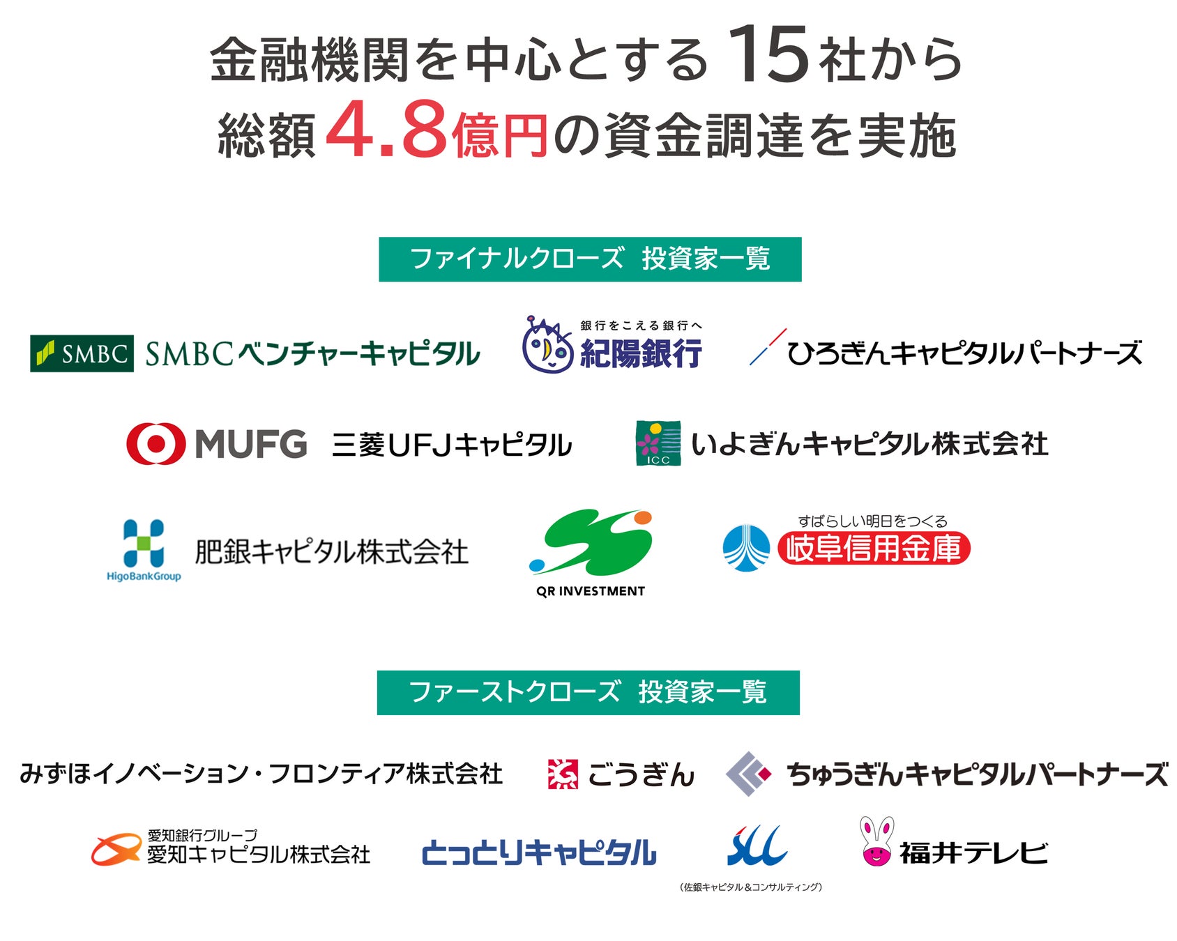 ファイナルクローズでは、SMBCベンチャーキャピタル株式会社、株式会社紀陽銀行、ひろぎんキャピタルパートナーズ株式会社、三菱UFJキャピタル株式会社、いよぎんキャピタル株式会社、肥銀キャピタル株式会社、株式会社QRインベストメント、岐阜信用金庫の計8社から1.8億円の調達を行いました。