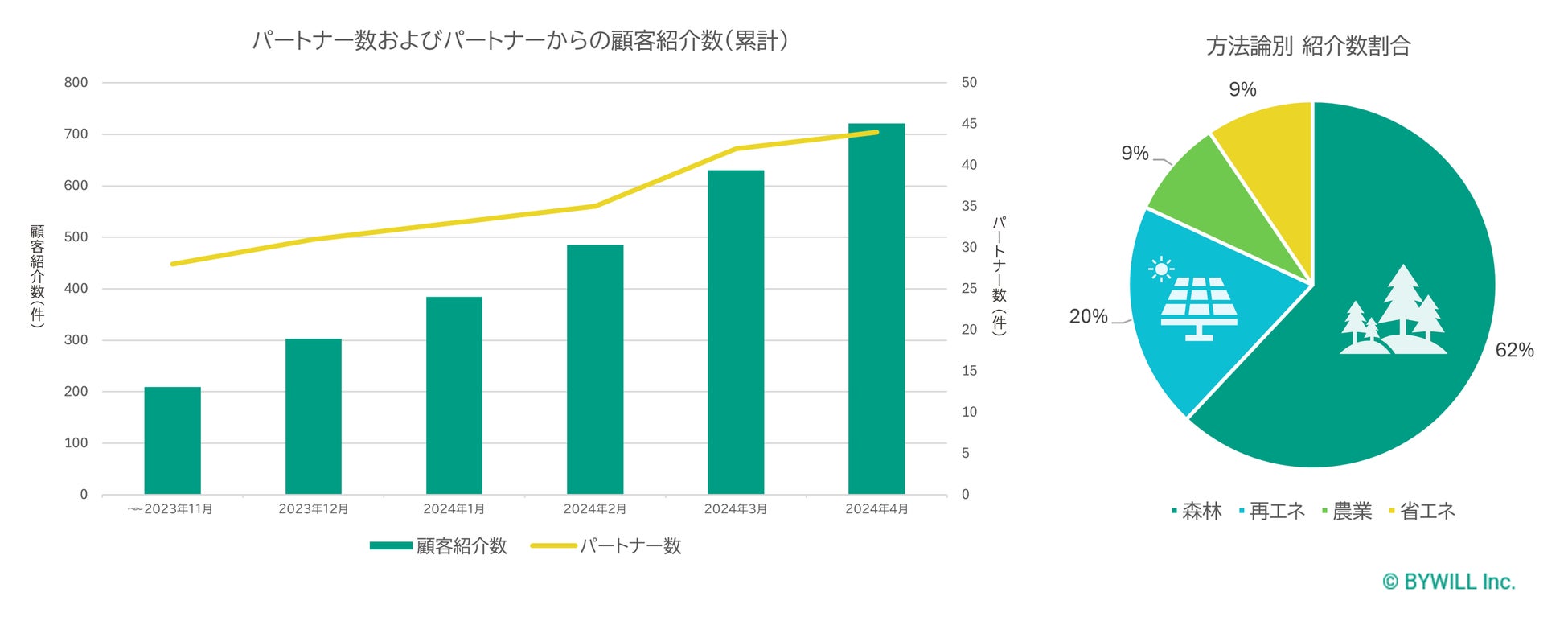 カーボンクレジットの創出元は、連携する地域金融機関、都市銀行、保険会社、テレビ局等のパートナーから紹介を受けていますが、その数は右肩上がりに増加し、現在では700件を超えています。また、連携するパートナーも40を超えました。
