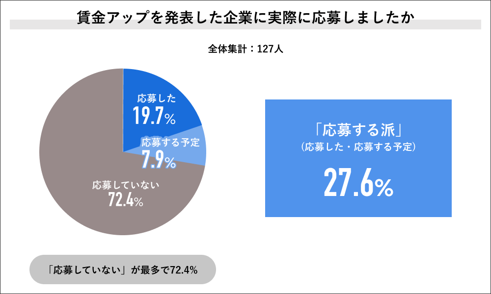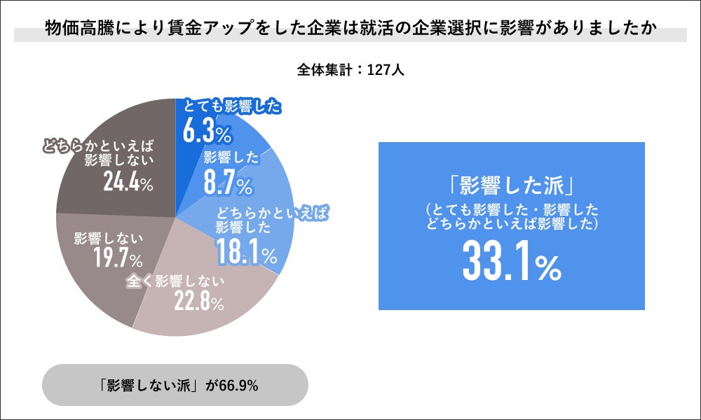 | 【TOPICS】 ・全体の33.1%が物価高騰による企業の賃上げに就活での企業選定が影響したと回答 ・全体の27.6%が賃上げした企業に実際に応募したとしたと回答 ・応募した理由では「企業の対応力と将来性に好感を持った」など類似回答が顕著 |