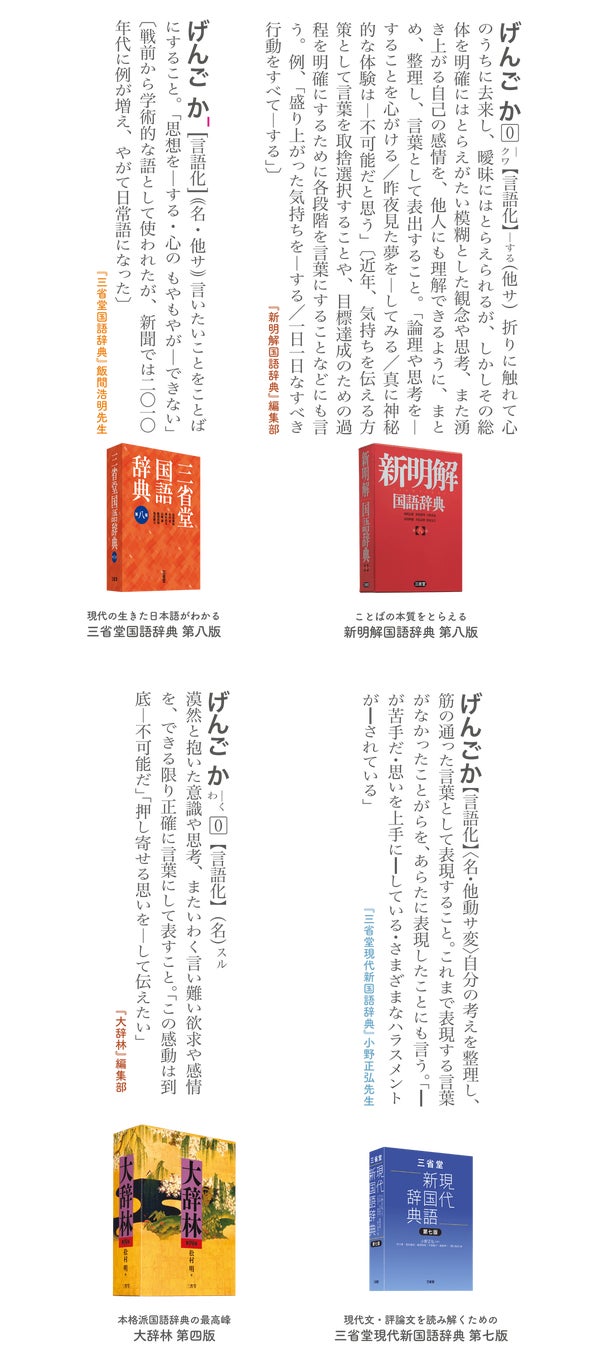 げんご か[言語化]⦅名・他サ⦆ 言いたいことをことばにすること。「思想を━する・心の もやもやが━できない」〔戦前から学術的な語として使われたが、新聞では二〇一〇年代に例が増え、やがて日常語になった〕