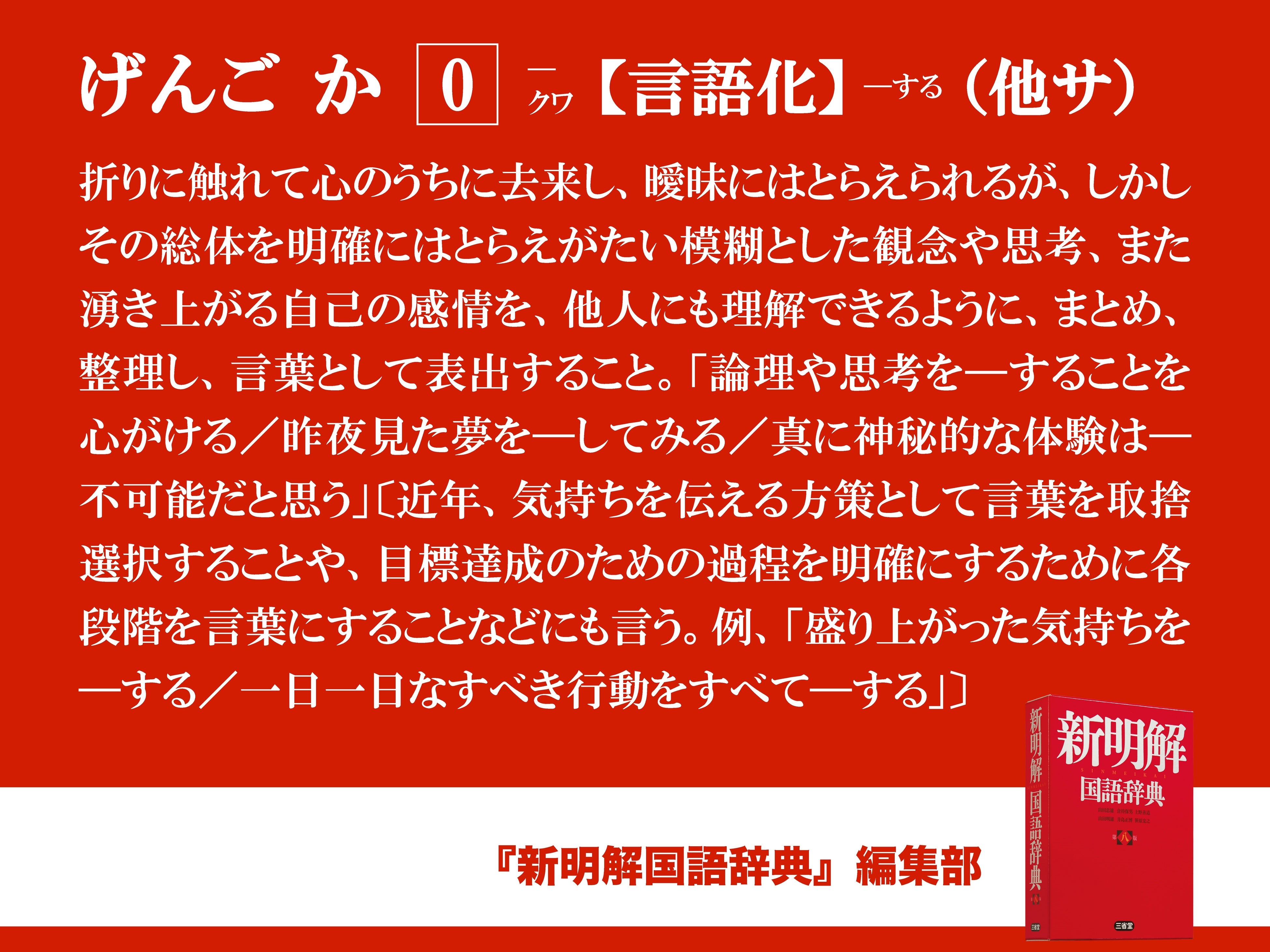 げんご か [0] -クワ【言語化】-する(他サ)折に触れて心のうちに去来し、曖昧にはとらえられるが、しかしその総体を明確にはとらえがたい模糊とした観念や思考、また湧き上がる自己の感情を、他人にも理解できるように、まとめ、整理し、言葉として表出すること。「論理や思考を━することを心がける/昨夜見た夢を━してみる/真に神秘的な体験は━不可能だと思う」〔近年、気持ちを伝える方策として言葉を取捨選択することや、目標達成のための過程を明確にするために各段階を言葉にすることなどにも言う。例、「盛り上がった気持ちを━する/一日一日なすべき行動をすべて━する」〕