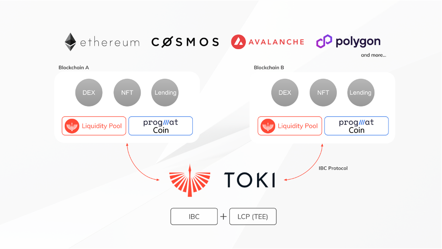 TOKIは、パブリックブロックチェーン間でクロスチェーン取引を可能にする「クロスチェーンブリッジ」の開発を行っており、2023年内のローンチを予定しています。IBC(*1)やDatachainが開発するLCP(*2)を用いた安全性と拡張性に優れたブロックチェーン間通信の技術に加え、高効率な流動性の仕組みに強みを持っています。