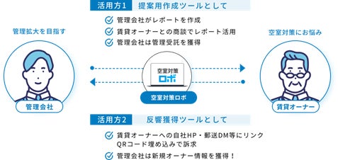 「空室対策ロボ」は、累計100億件※1の不動産ビッグデータとAIを駆使することで、賃貸住宅ごとに異なる高度な「満室戦略レポート」をWEB上で作成できる賃貸管理会社の営業支援DXサービスです。空室に困るオーナーへの提案、信頼獲得により、賃貸管理会社は管理戸数拡大につなげることが可能です。