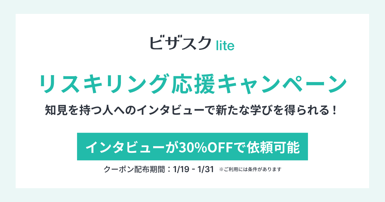 そこでこの度当社では、インタビューで社外から学びを得られる「ビザスクlite」をお得にご利用いただける”リスキリング応援キャンペーン”を開始することとなりました。ぜひ、「ビザスクlite」にご登録の上、本日1/19から配布されるクーポンを利用し手軽にリーズナブルに、「学び直し」をお試しください。