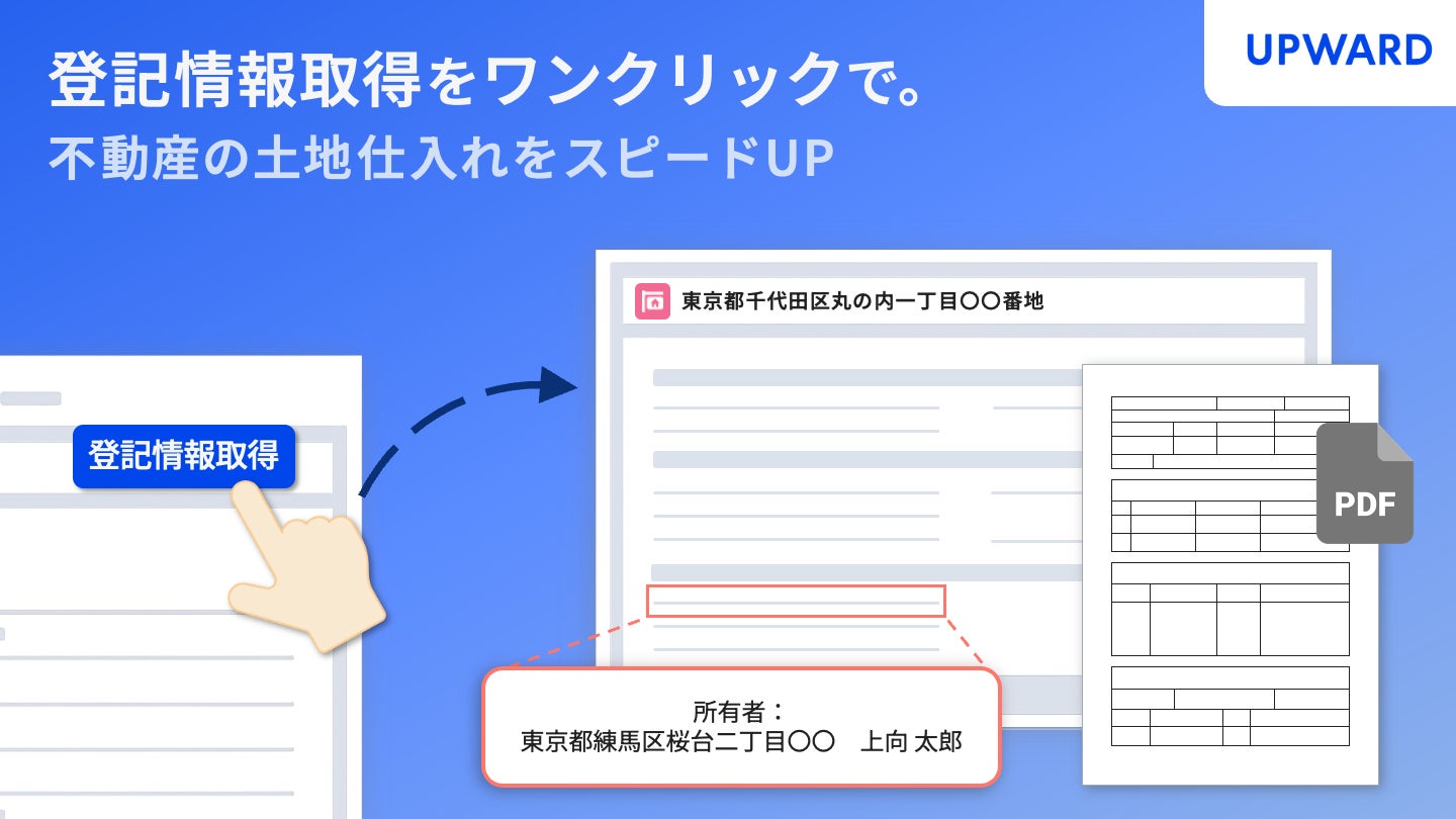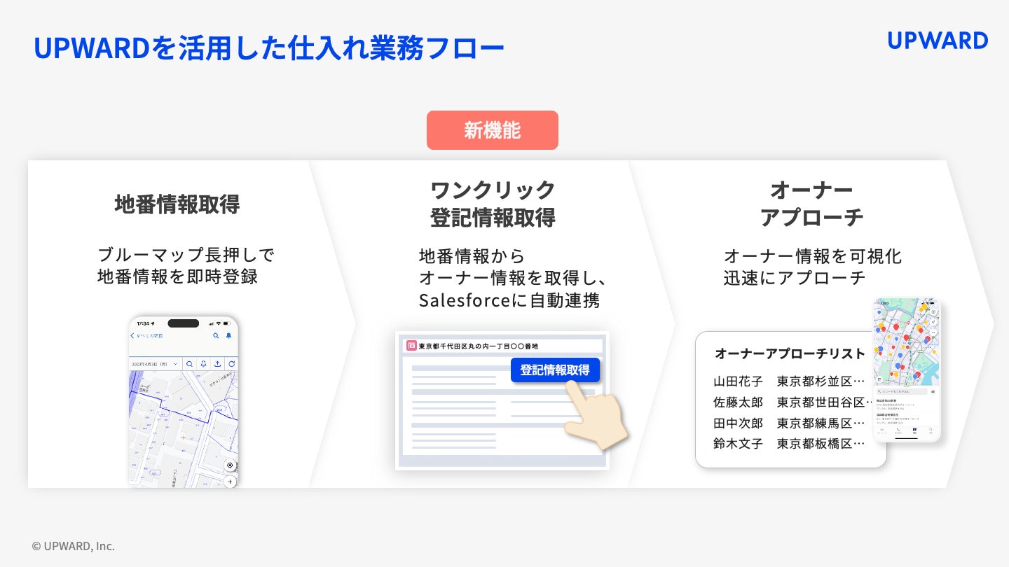 UPWARD株式会社(所在地:東京都千代田区、代表取締役 CEO:金木 竜介、以下 UPWARD)は、Salesforce※1上で登記情報をワンクリックで取得できる新機能の提供を開始しました。本機能と、UPWARDおよびSalesforceの既存機能を組み合わせて利用することで、土地仕入れに関わる業務プロセスを一気通貫で効率化・迅速化できます。