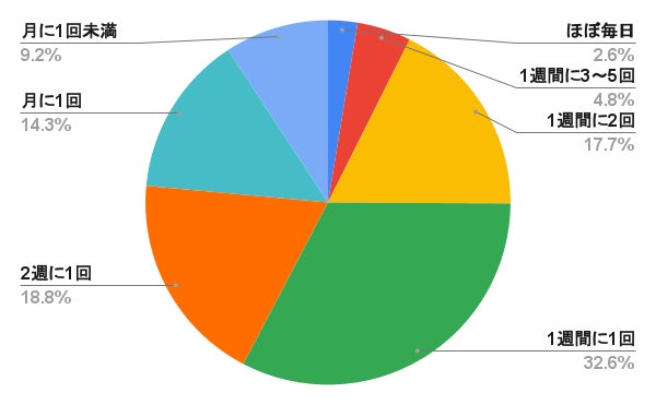 子どもの年齢別でみると、「0~2歳」の家庭では「ほぼ毎日」という回答も12.3%見られました。一方、子どもが中学生になる「13~15歳」の家庭では、「月に1回」「月に1回未満」という回答が55.4%を占める結果となりました。