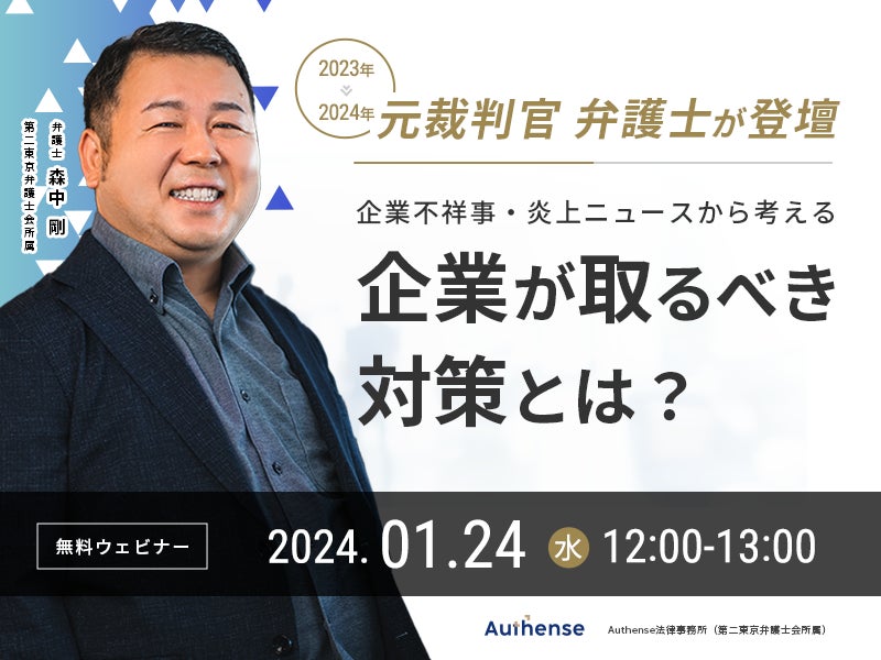 【無料ウェビナー開催2024.1.24】元裁判官 弁護士が登壇2023年の企業不祥事・炎上ニュースから考える 2024年に企業が取るべき対策とは?|Authense法律事務所