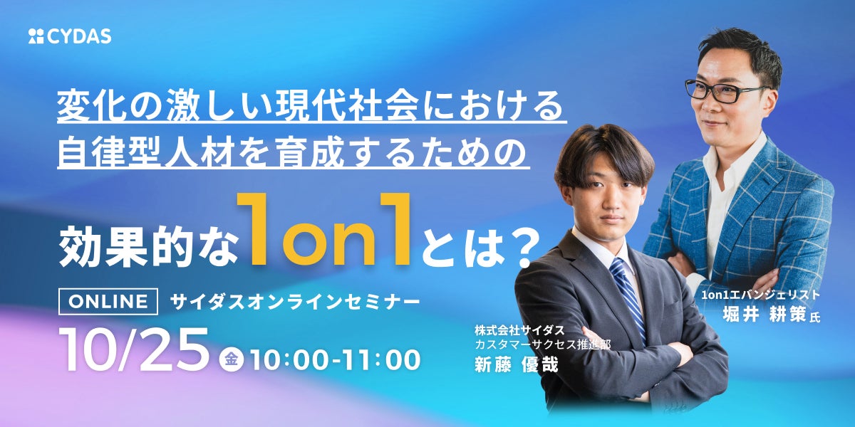 人材データプラットフォーム「CYDAS(サイダス)」の開発・販売を手がける株式会社サイダス(本社:東京都港区、代表取締役:松田 晋、以下 サイダス)は、10月25日(金)10時より、人事担当者向けの無料セミナー「変化の激しい現代社会における自律型人材を育成するための効果的な1on1とは?」を開催いたします。