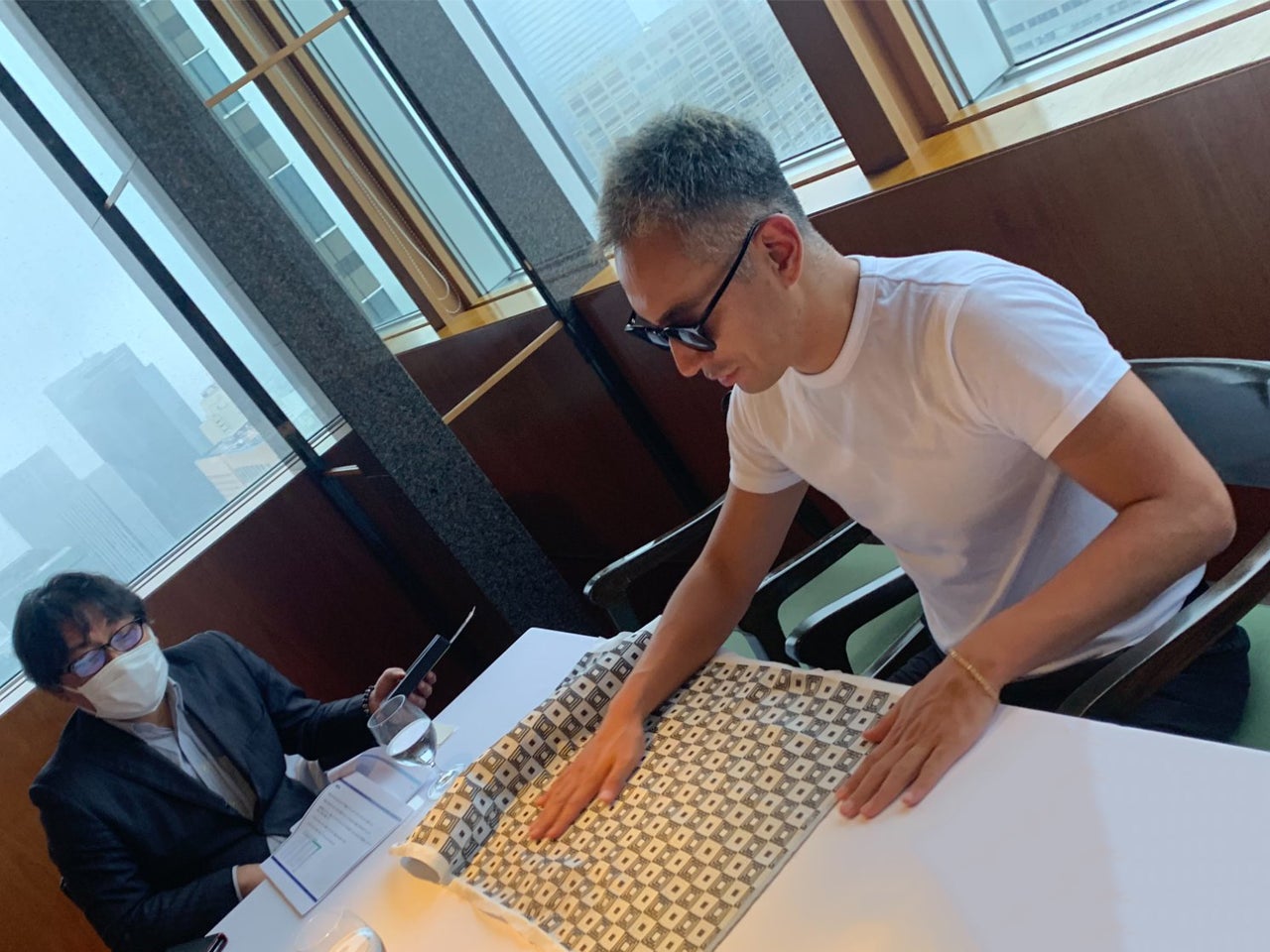 最初のコラボは、「京都西陣 ふくおか」の福岡裕典さん。サステイナブルな再生繊維に京都西陣織の伝統を掛け合わせてきたつくり手です。福岡さんとともに、本来であればゴミとして捨てられるペットボトルを「再生」し、市川家に縁のある三升紋を織り込んだ見事な西陣織のスマートフォンケースを完成させました。