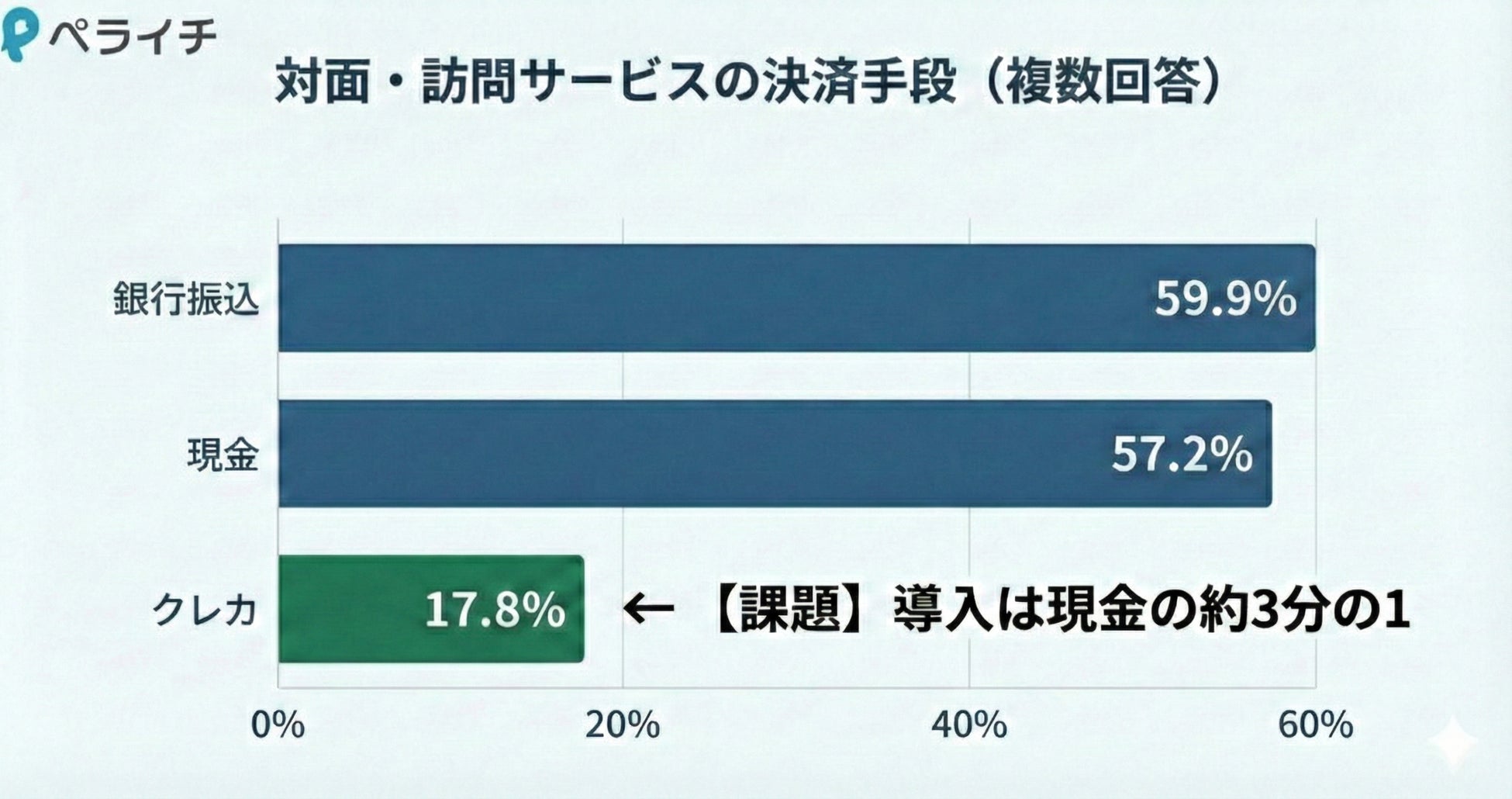 対面サービス事業者において、クレジットカード決済を導入しているのは17.8%でした。「現金・銀行振込」への依存が高いため、手持ち現金がない顧客の離脱リスクが高い状態です。