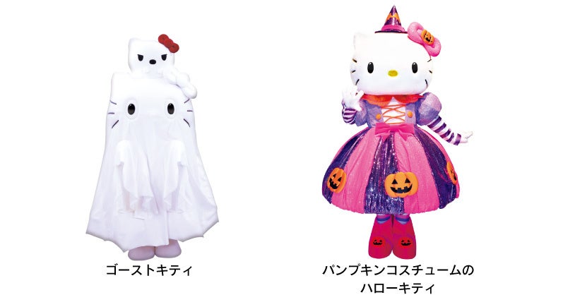 ハーモニービレッジでは日替わりで、ハロウィーンのコスチュームを身にまとったキャラクターとハイタッチを楽しめます。ハローキティも「ゴーストキティ」や、ハロウィーンらしくかぼちゃをあしらったコスチュームに変身して登場します。