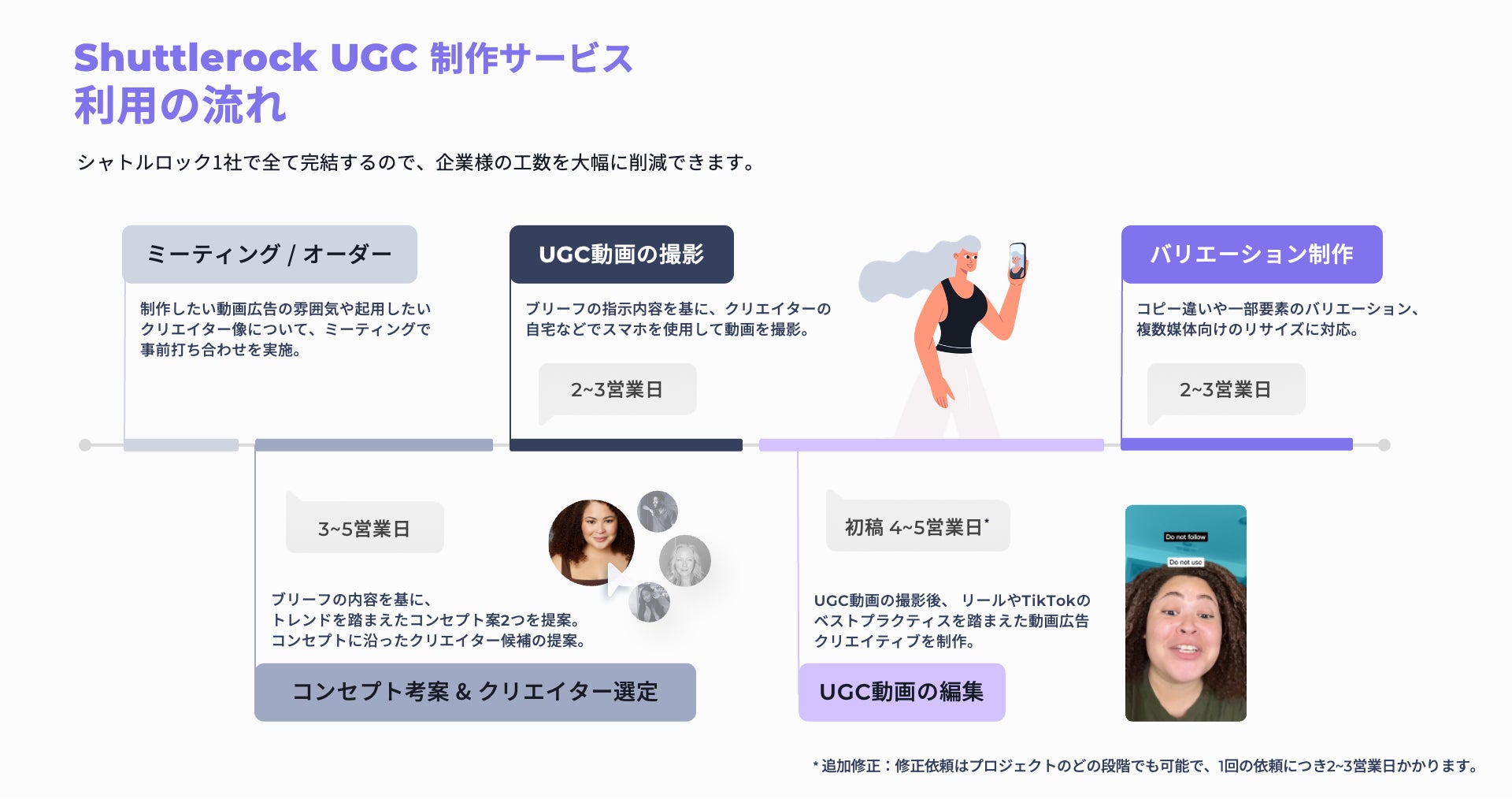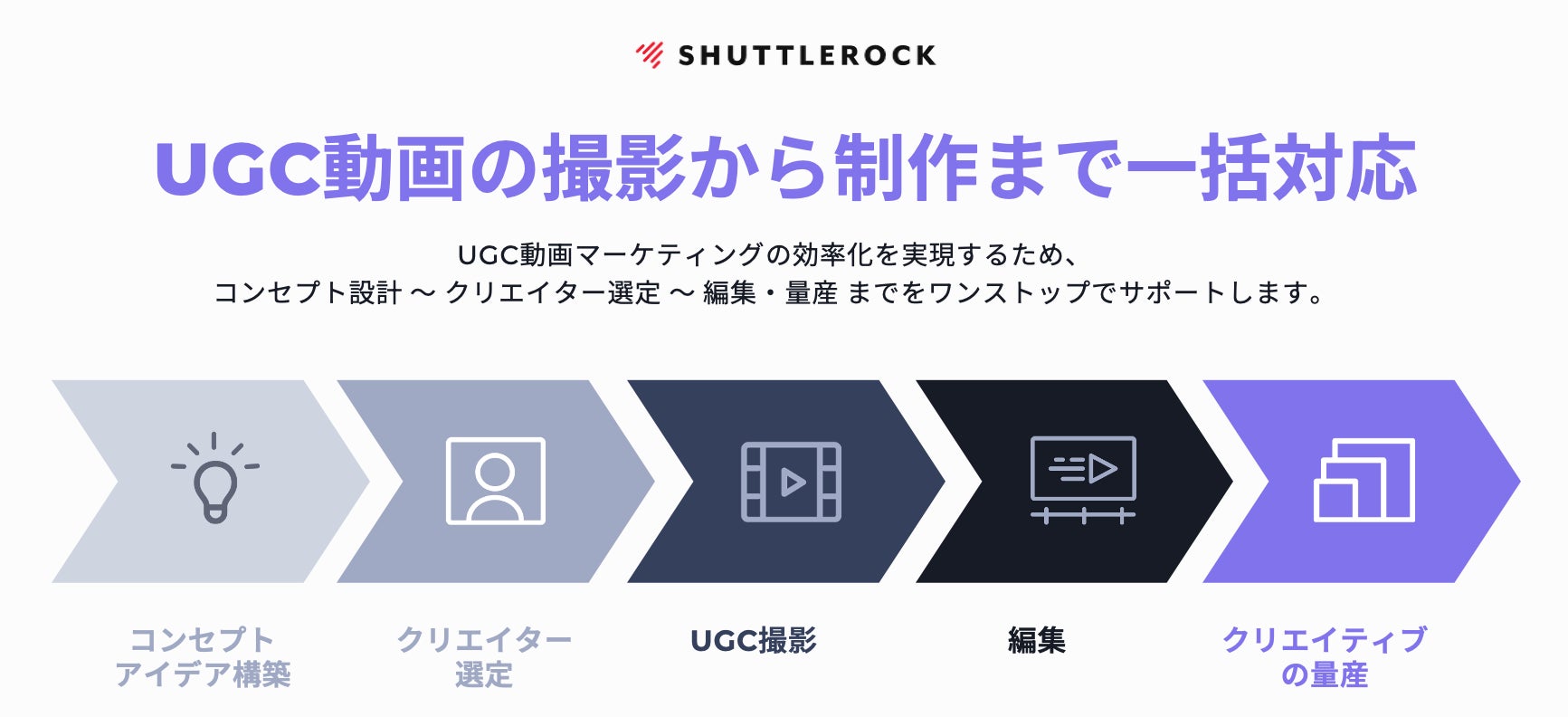 そこでシャトルロックジャパンは、各SNS媒体に合わせたトレンドに基づいて、コンセプト考案からクリエイター選定・撮影・動画編集までを一括でサポートする「Shuttlerock UGC 動画制作サービス」を提供開始いたしました。