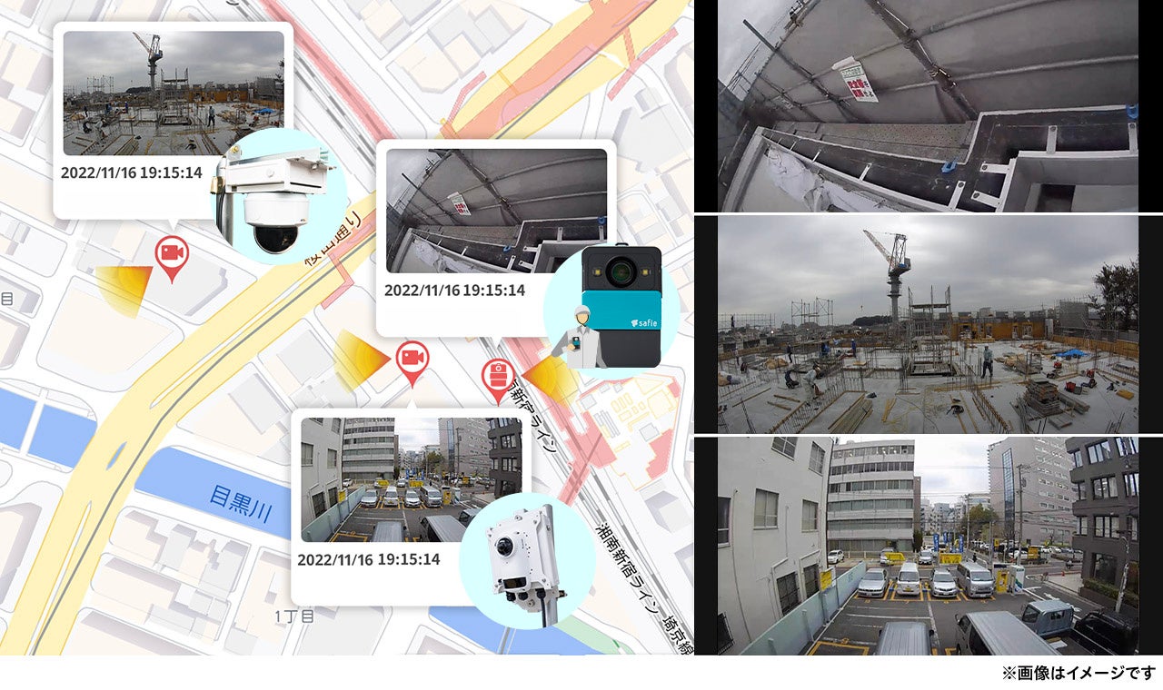 また、既にGPSによる位置情報取得機能を搭載したウェアラブルクラウドカメラ「Safie Pocket2」(※2)と、現場に設置された定点カメラである「Safie PROプラン」対応カメラや「Safie GO」シリーズが撮影した映像の各々の位置情報を一元管理することができます。これにより、実際の作業現場とその周辺状況を同時に確認するなど、業務においてさらなる安全性の向上が期待できます。