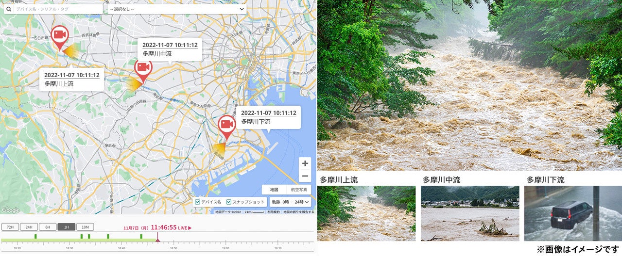 大雨などの災害時に、各流域に設置したカメラアイコンをクリックするだけで、選択したカメラのストリーミング映像を確認し、各流域の状況を即座に把握することに繋がります。