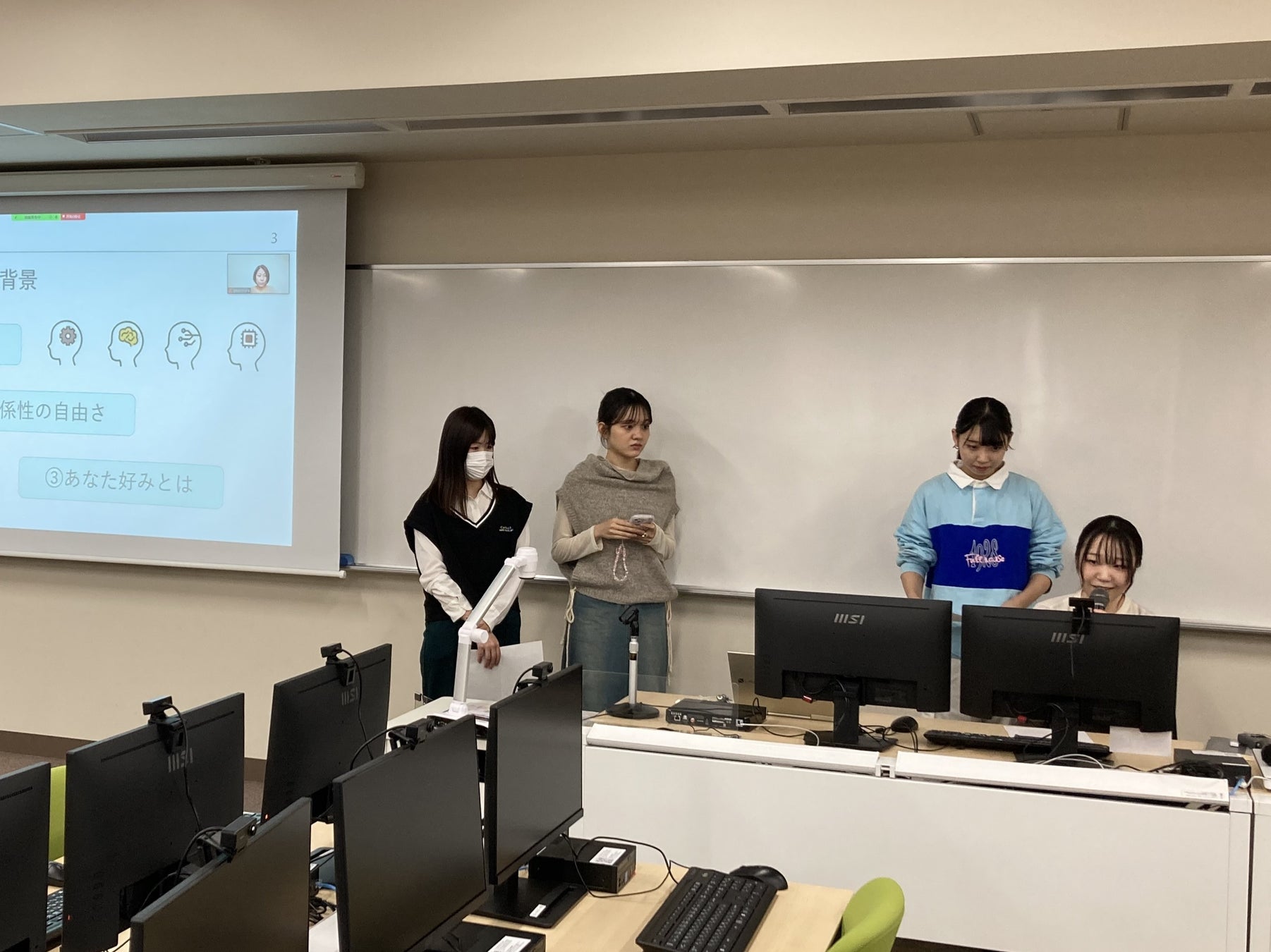 一方で、甲南大学の心理学を学ぶ学生としても、グループワークをまとめ、直接企業のスタッフに発表するという機会は今後の社会活動において大事な経験になったかと思います。また、「悩み」「愚痴」を常に抱えている人が多い現代において、心の内を吐露できる対象として、人以外のAIという存在を認識していただくきっかけになりました。