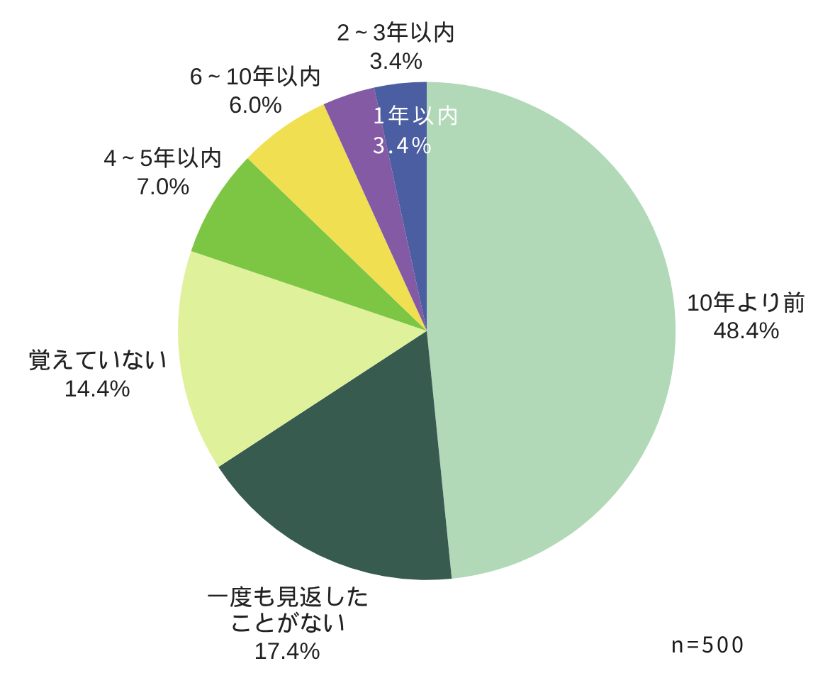 続いて、卒業アルバムを最後に見た時期について尋ねたところ、約48%が「10年以上前」と回答しました。多くの人が手元に残している一方で、日常的に見返しているわけではなく、“存在しているが開かれていない”状態にあることが分かります。