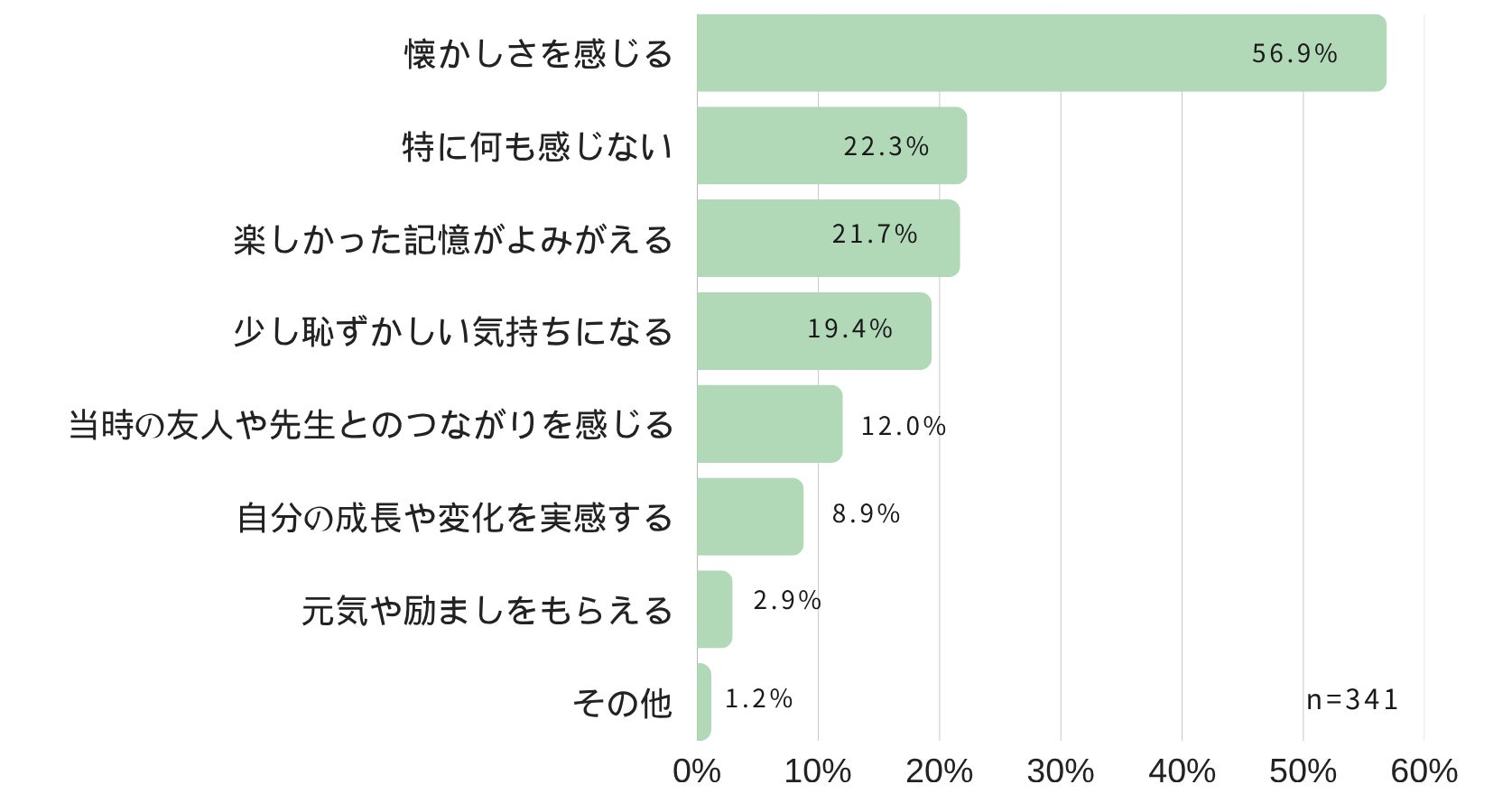 一方で「楽しかった記憶がよみがえる」 「少し恥ずかしい気持ちになる」がそれぞれ約20%、さらに「特に何も感じない」も約20%という結果となりました。