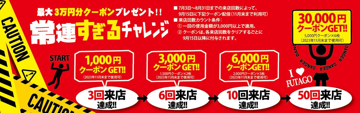 常連すぎるチャレンジは、F-POINT会員様限定のイベントです。7月3日~8月31日まで来店回数に応じて、11月末まで使えるクーポンをプレゼント!詳細は店舗のメニューチラシをご確認ください。