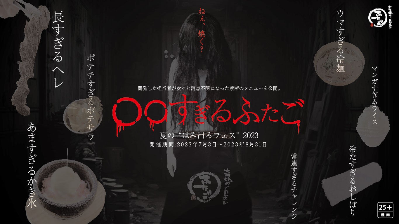 「大阪焼肉・ホルモン ふたご」を世界展開する株式会社FTG Company(本社:東京都目黒区、代表取締役社長:李 純哲)は、「名物!!黒毛和牛のはみ出るカルビ」だけではなく、色々はみ出てしまう「夏の“はみ出る”フェス2023」を7月3日(月)より開始します。〇〇すぎるメニューやサービス、名物一口冷麺はふたご史上初、5種類の新バージョンが期間限定で登場!