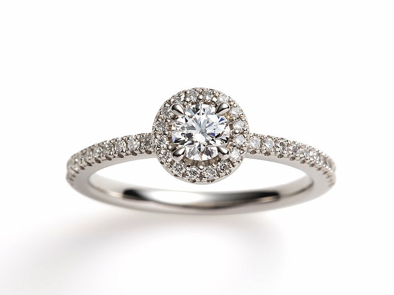 細身のアームと熟練の職人の手でひとつひとつ丁寧に石留めした極小のダイヤモンドが特徴的なエンゲージリング。