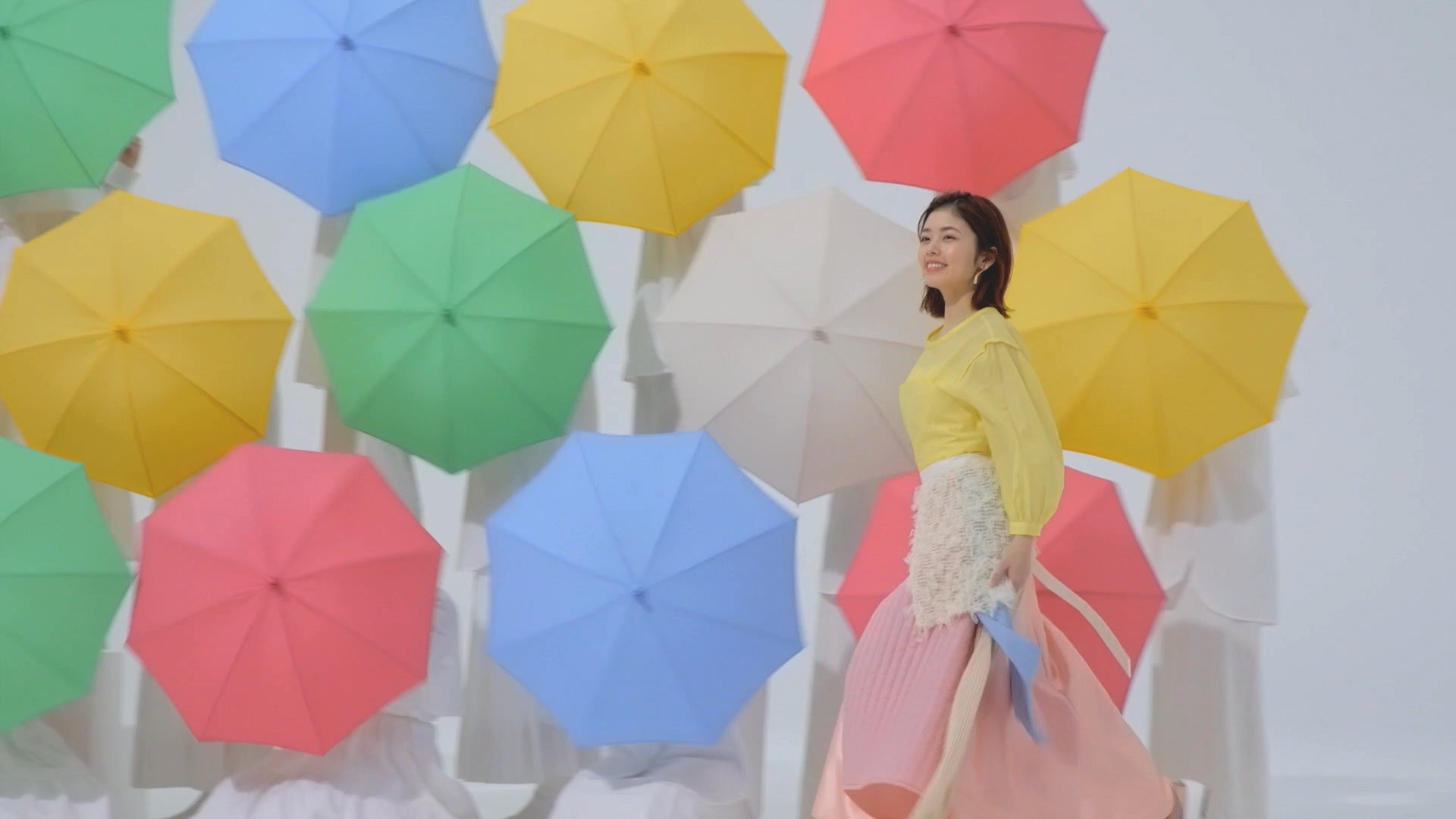 2.色とりどりの傘の間を散歩をするように楽し気に歩きまわる小芝さん。